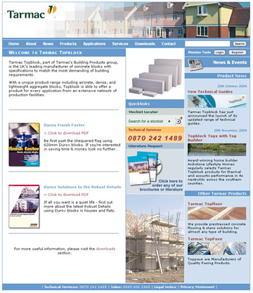 Our website designers were asked to come up with a completely new 網頁設計 for Tarmac Topblock. As the UK's leading producer of Aggregate and Aircrete Blocks for the construction industry, Tarmac Topblock needed an easy to maintain site covering their large product range. The new website allows easy cross referencing of products and their applications.