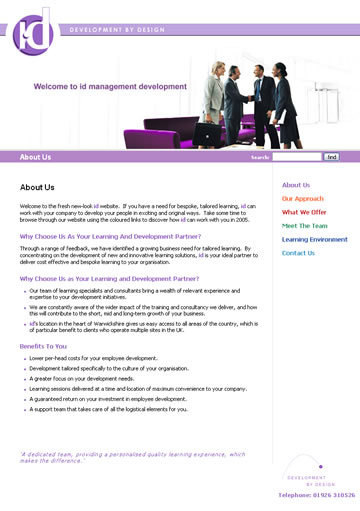 Welcome to the fresh new-look id website. If you have a need for bespoke, tailored learning, id can work with your company to develop your people in exciting and original ways. Take some time to browse through our website using the coloured links to discover how id can work with you in 2005.